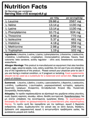 - Γρηγορότερη Μυϊκή Αποκατάσταση: Τα EAA (ειδικά L-Methione & L-Lysine) υποστηρίζουν την επισκευή των ιστών μετά από εντατική άσκηση ή τραυματισμούς, ενώ οι L-Isoleucine & L-Valine, μειώνουν τον πόνο και την κούραση των μυών, επιτρέποντάς σας να ανακάμψετε άμεσα και να είστε έτοιμοι να τα δώσετε όλα στην επόμενη προπόνησή σας.